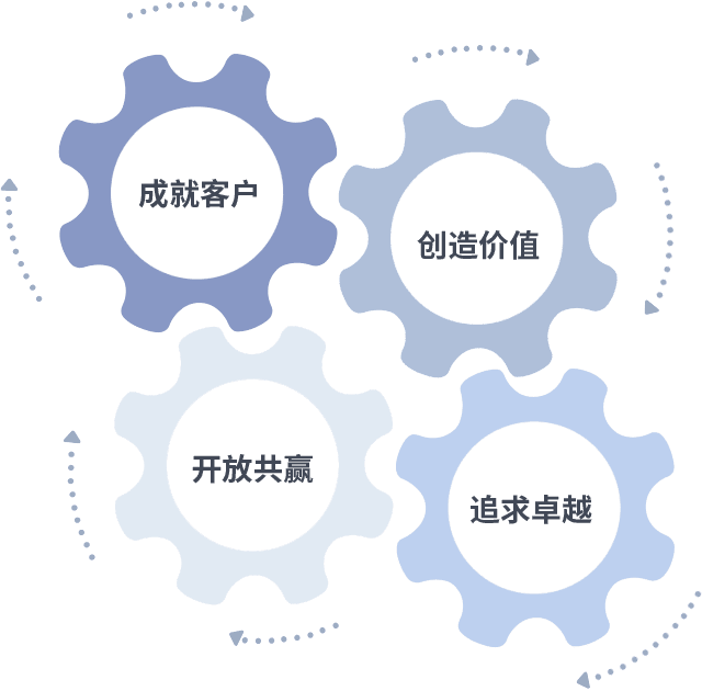 成就客户是一切决策的出发点,,,,创造价值是衡量所有工作的标准,,,,追求卓越是我们做事做人的态度,,,开放共赢是我们的格局也是最终的结果。。。。价值观的齿轮环环相扣,,推动着组织里的每个人不断向前。。