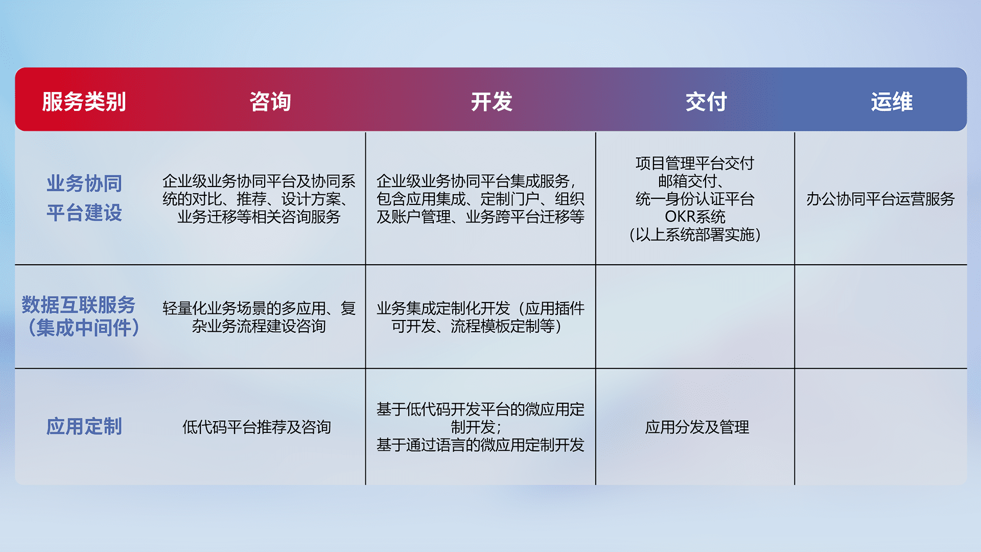 针对钉钉、、、企微、、、IDaas等平台级产品提供产品的规划、、、、方案、、、、交付、、、、定制化开发等服务,,实现如统一协同办公、、、、智能客户服务、、、、混合会议管理、、智能数据查询、、、等业务场景,,实现数字化转型。。。。